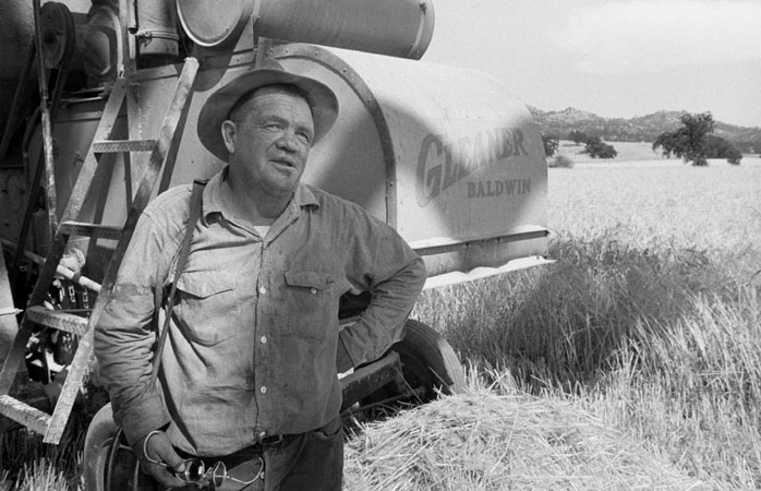 Worker next to combine harvester, Berryessa Valley, 1956